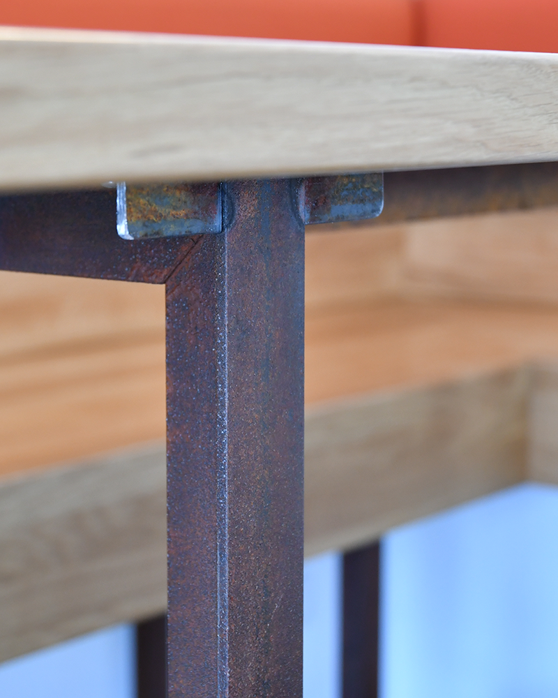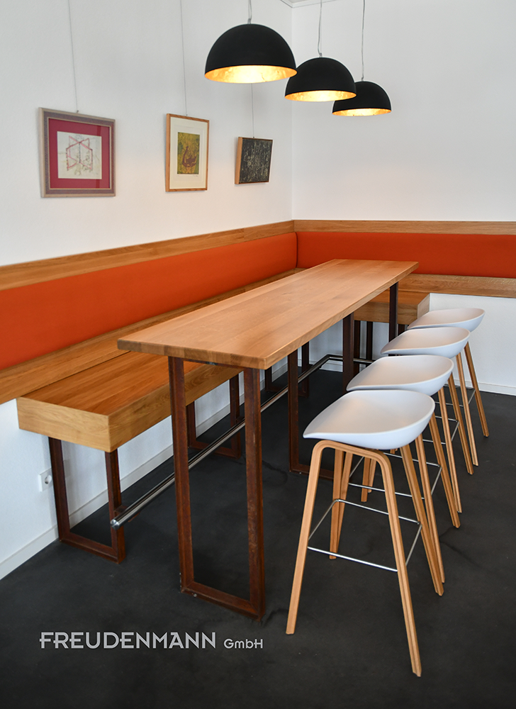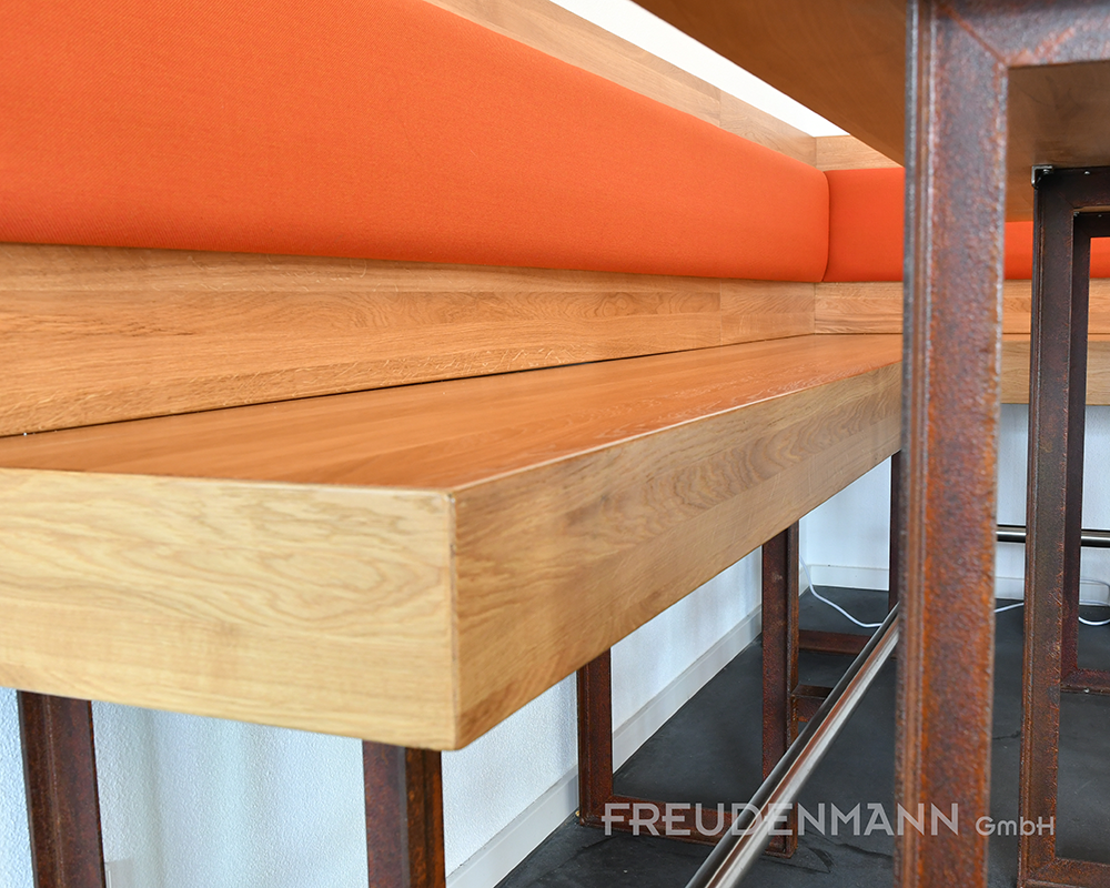 Eine gemütliche Eckbank – aus Stahl, Eichenholz und frischem Leder – lädt zum Verweilen ein und inspiriert zu guten Gesprächen.