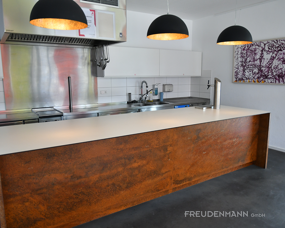 Edelstahl, Holz und Cortenstahl ergeben hier eine harmonische Verbindung mit klarer Linie und warmer Ausstrahlung.