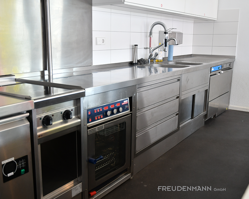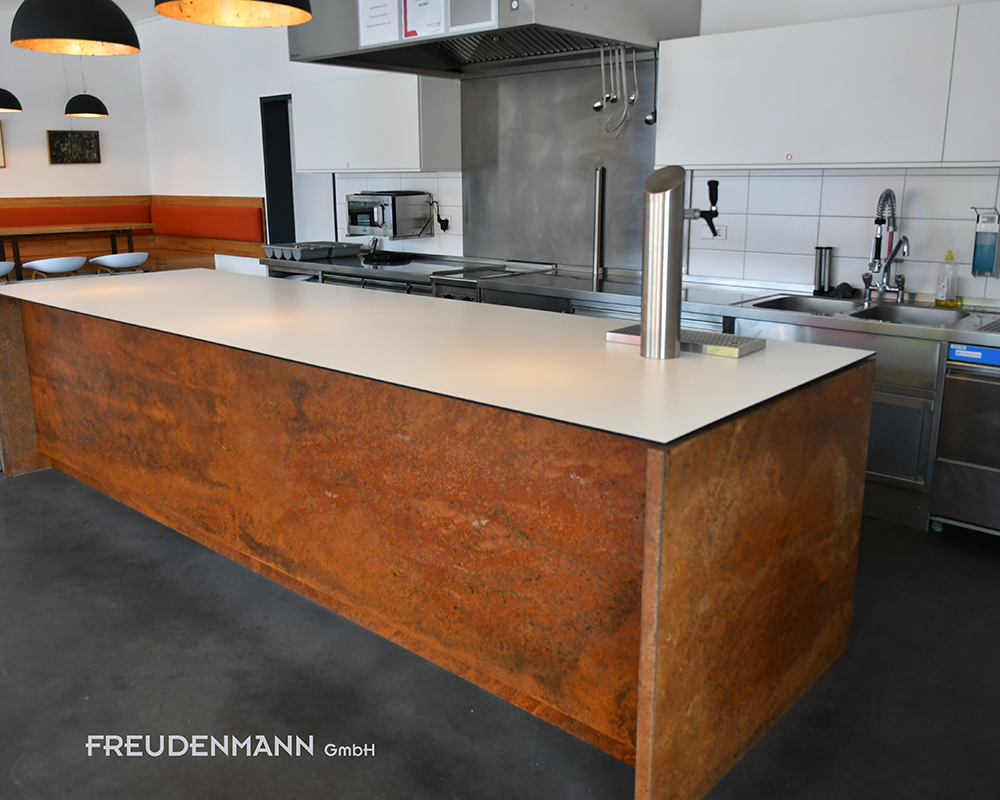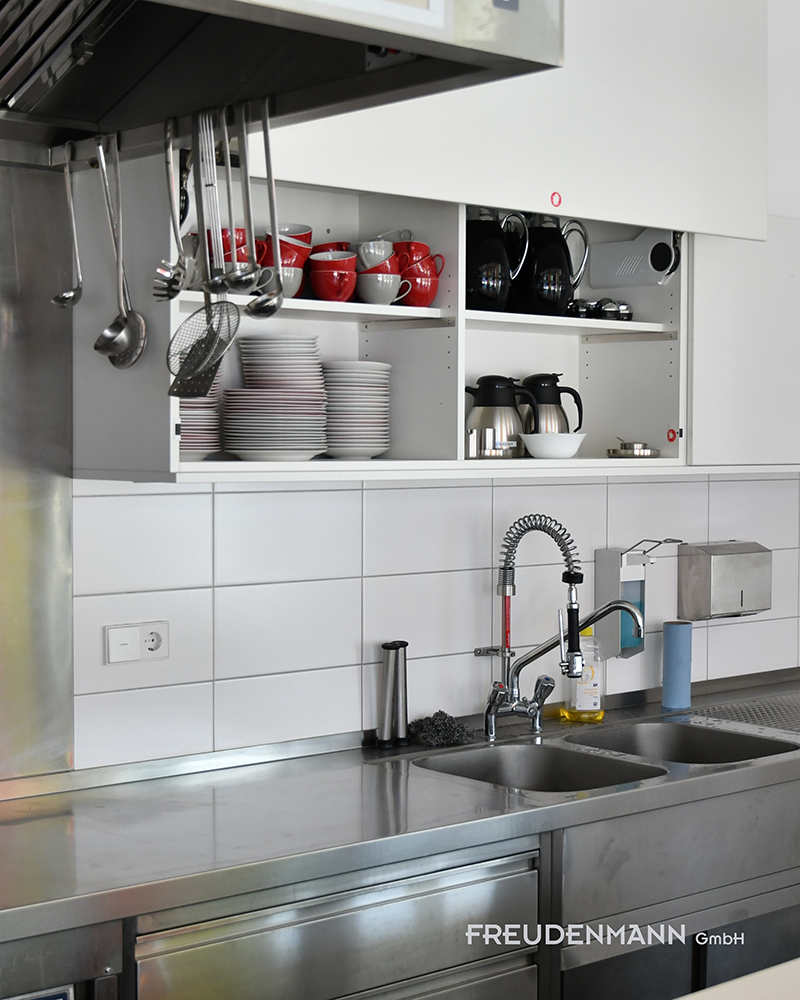Mit der richtigen Kombination und Auswahl der Materialien wirkt selbst eine Industrieküche authentisch und einladend.