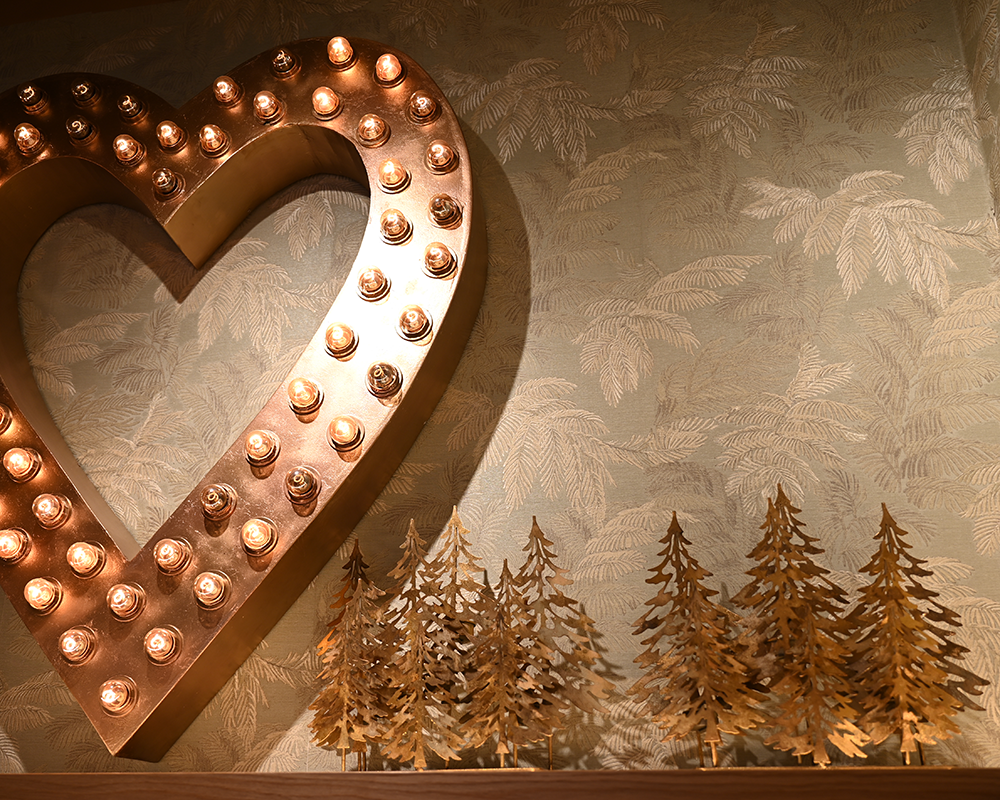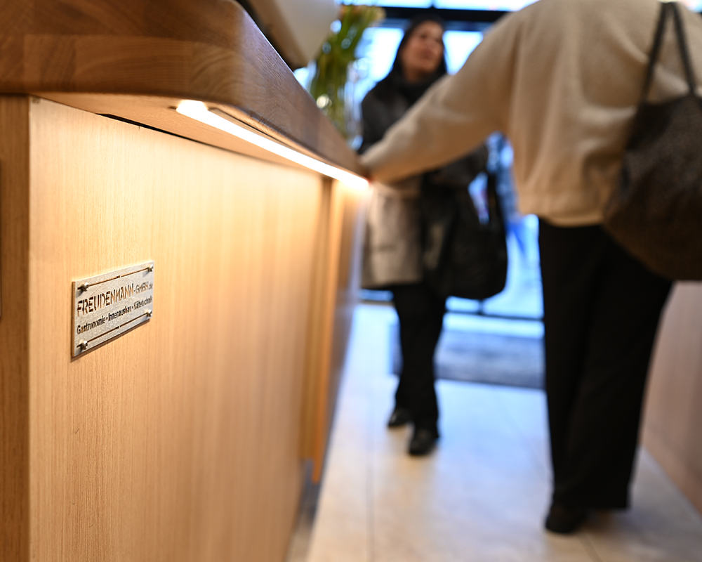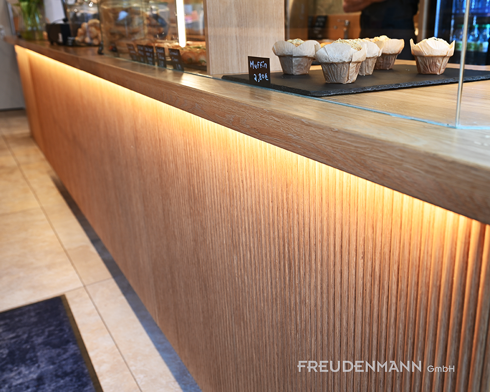 Gestalterisch prägt die Thekenfront aus massiven Eichenholzstäben den Raum. Indirekt mit LED hinterleuchtet entsteht eine warme, helle Atmosphäre, die trotz kompakter Fläche offen und einladend wirkt. Ergänzt wird das Konzept durch eine Akustikdecke mit senkrecht abgehängten Baffeln – für eine deutlich spürbar ruhigere Raumwirkung im laufenden Betrieb.