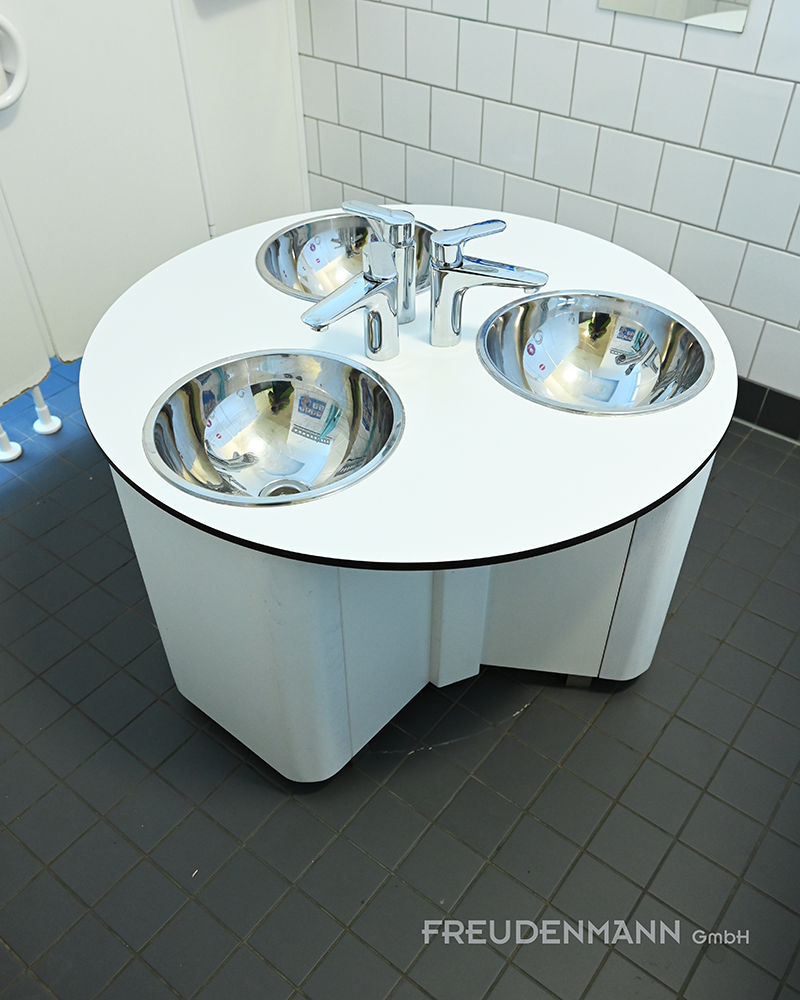 Die runde Platte ist mit drei eingelassenen Waschbecken ausgestattet und ermöglicht mehreren Kindern gleichzeitig die Nutzung.
