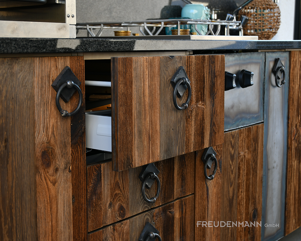 Die Fronten sind in Altholzausführung gefertigt, jede Maserung erzählt ihre eigene Geschichte.